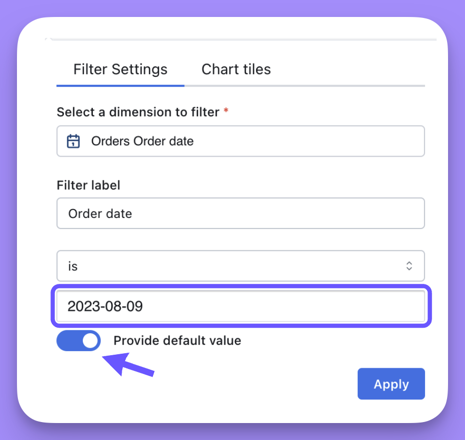 Then, in the Chart tiles tab, you can apply the filter to a SQL chart tile and choose the column you want that filter to apply to. - On a dashboard with only SQL Runner-based tiles, filters are created a little differently since SQL charts are based on columns instead of semantic fields.