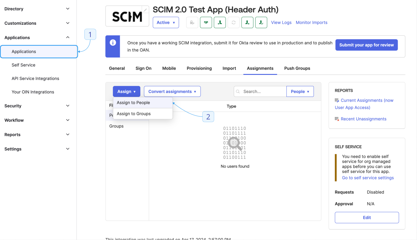 - Test the integration by clicking Assignments. Select Assign > Assign to people. Choose a user and click Assign > Save and Go Back. This user should be created in your Lightdash instance.